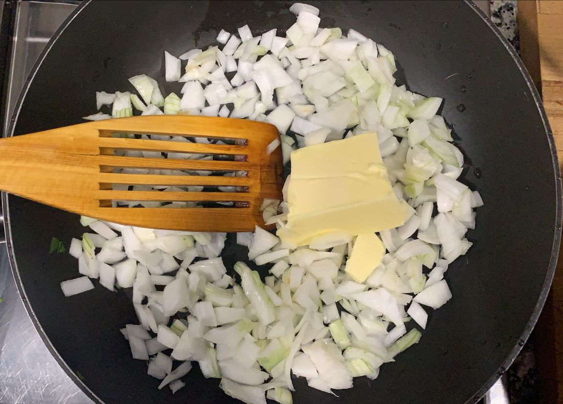 2.- Posem en una paella, a foc baix, la ceba i la mantega.