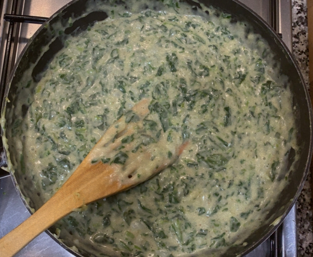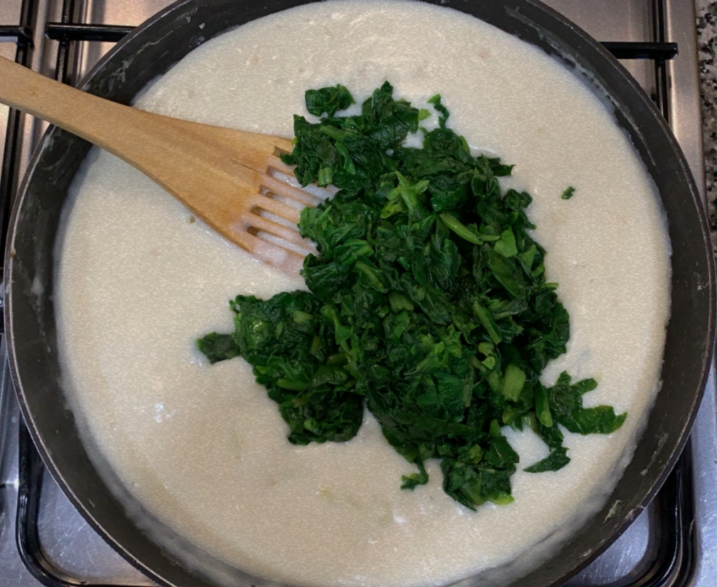 5.- Un cop tinguem la massa ben espessa, hi incorporarem els espinacs, i els integrarem bé a la barreja.
