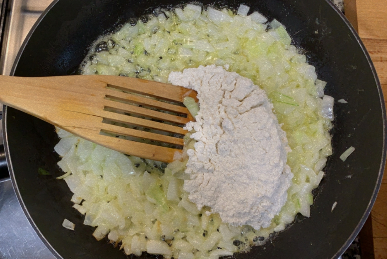 3.- Un cop tinguem la ceba daurada, hi afegim la farina fins que aquesta s’integri.
