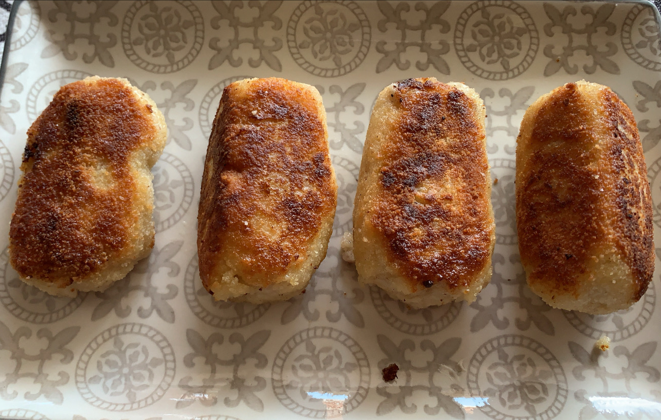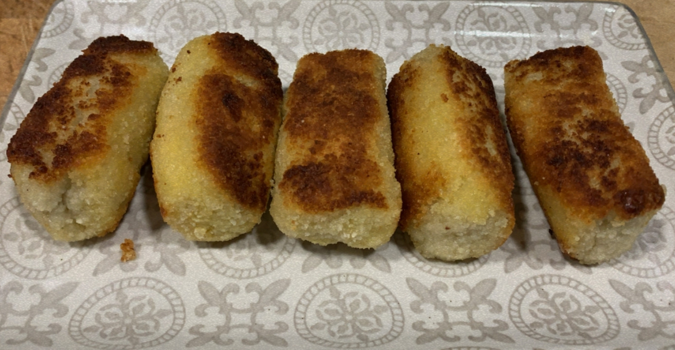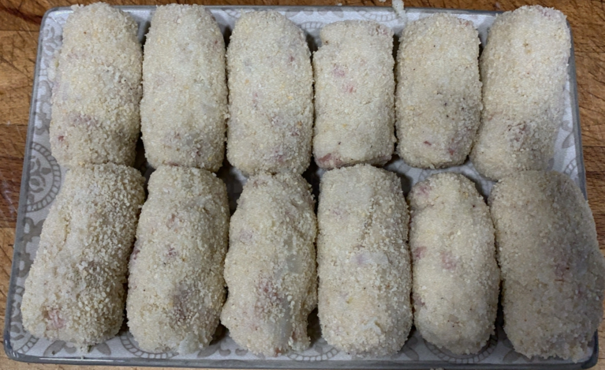 6.- Posem la massa a un tupper coberta amb film i la deixem refredar. Un cop freda, la posem a la nevera unes 12 hores. Traiem la massa de la nevera, i posem un bol amb pa ratllat i l’altre amb un ou batut. Llavors, només ens quedarà fer la forma de les croquetes i passar-les per pa ratllat, ou i posteriorment pa ratllat. Coem les croquetes en una paella amb oli calent i ja podrem servir.