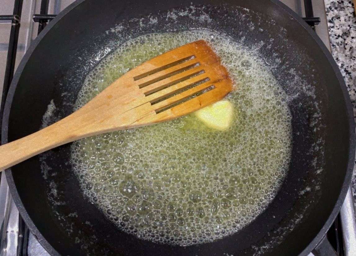 1.- Posem la mantega en una paella a foc mig.
