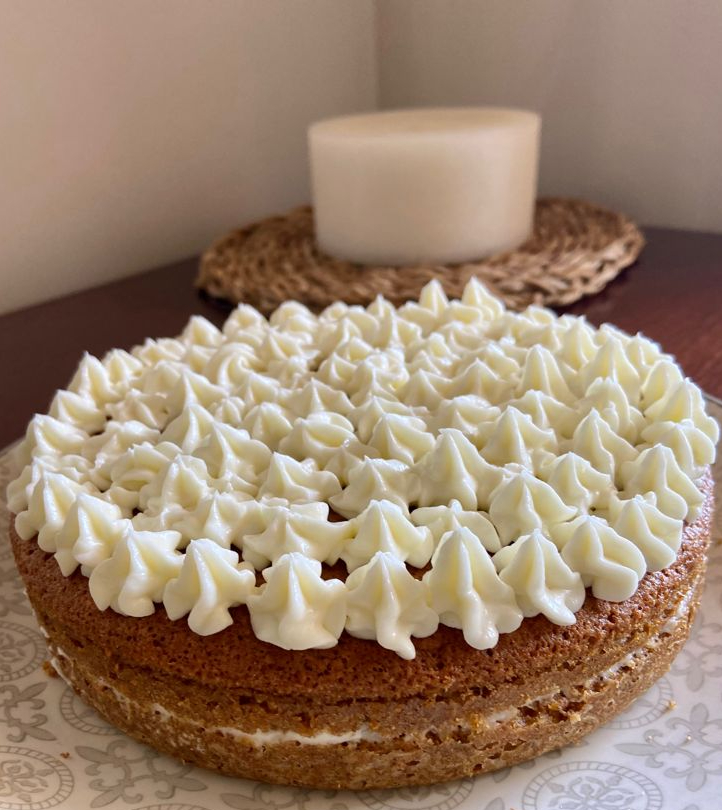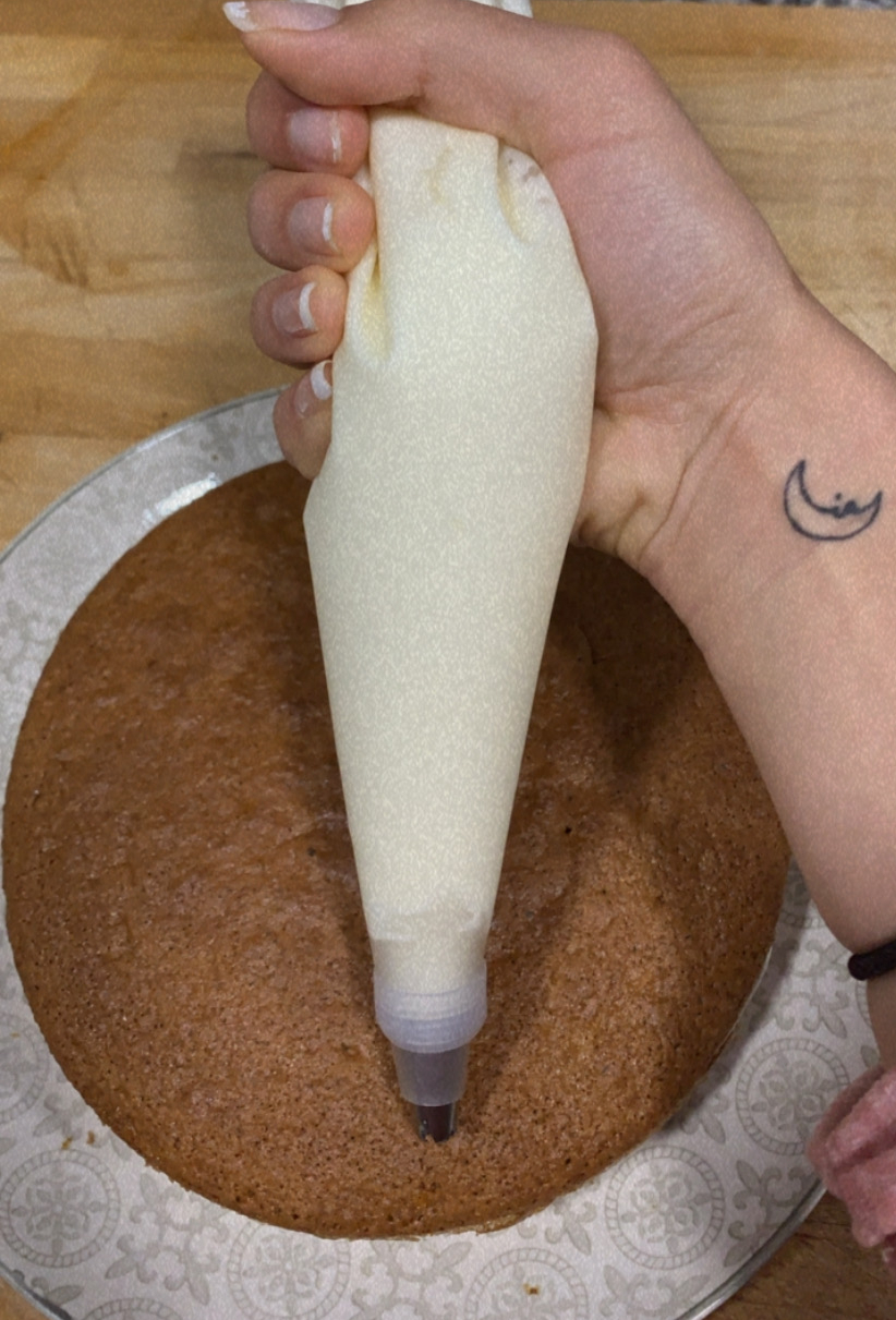 3.- Llavors, tanquem el pastís i el decorarem amb la cobertura. Per a fer-ho, podem utiltizar una mànega pastissera o una cullera.