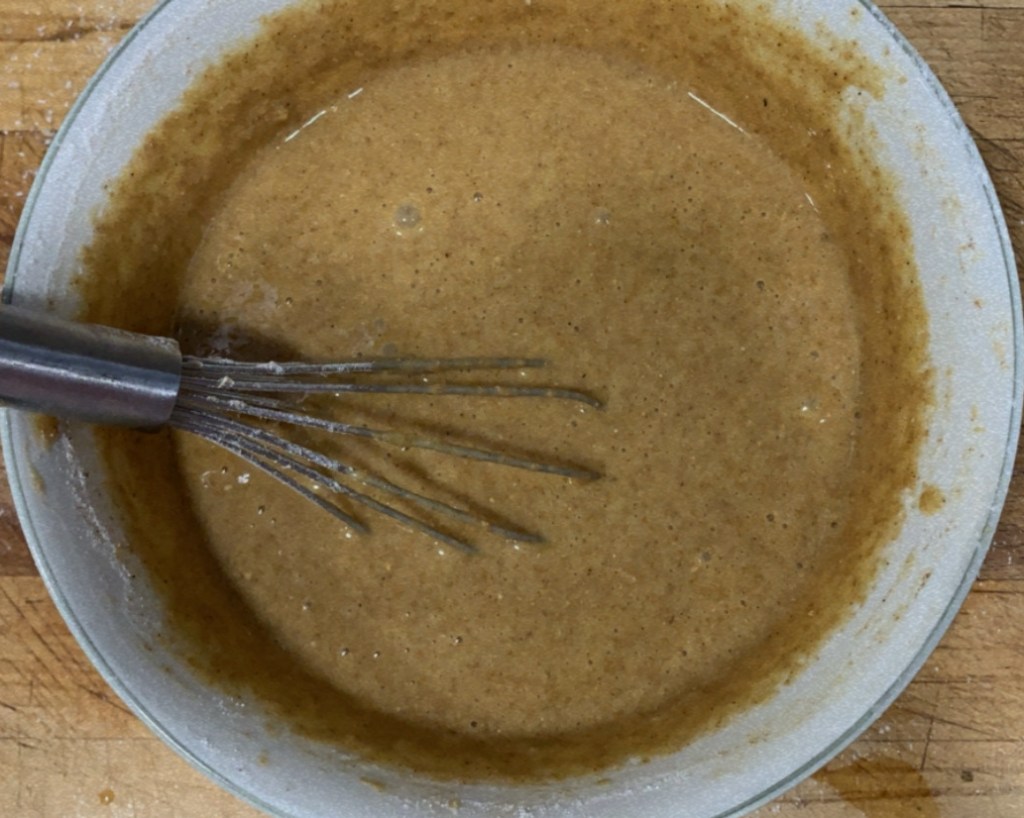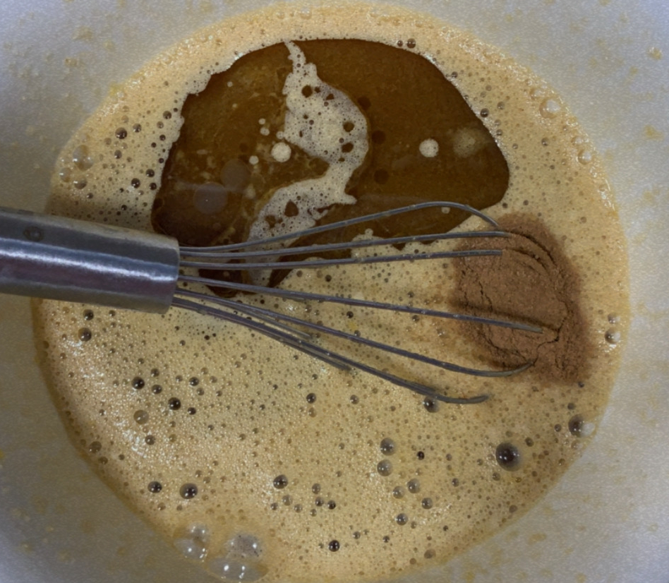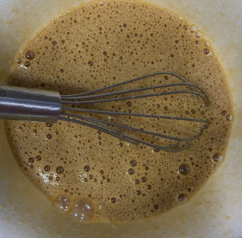 1.- En un bol, batem amb unes varilles manuals els ous i hi afegim el sucre moreno fins que s’integri, aconseguint una massa esponjosa.