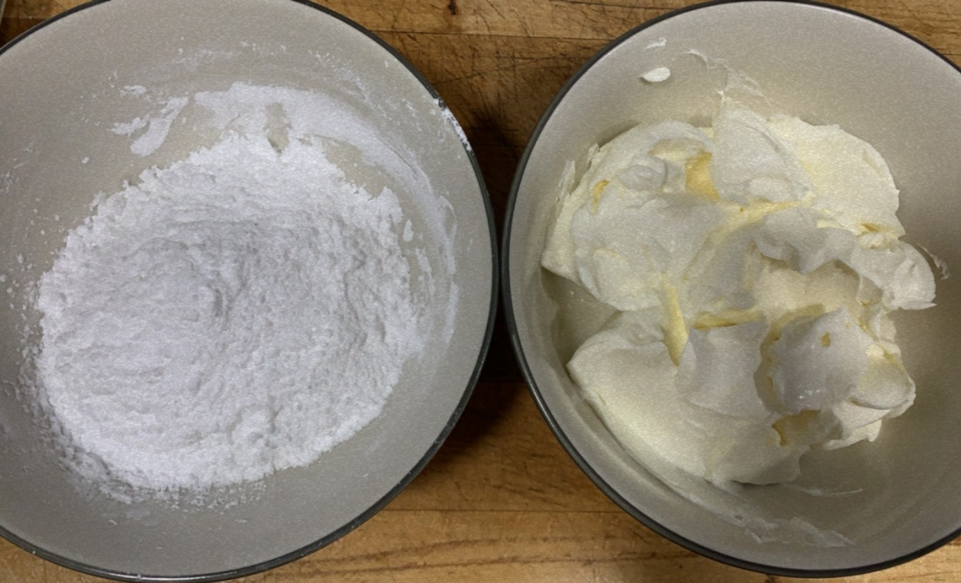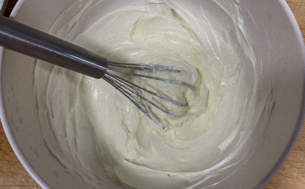 1.- Posem en un bol el formatge i el sucre i els batem amb unes varilles manuals fins aconseguir una massa cremosa.