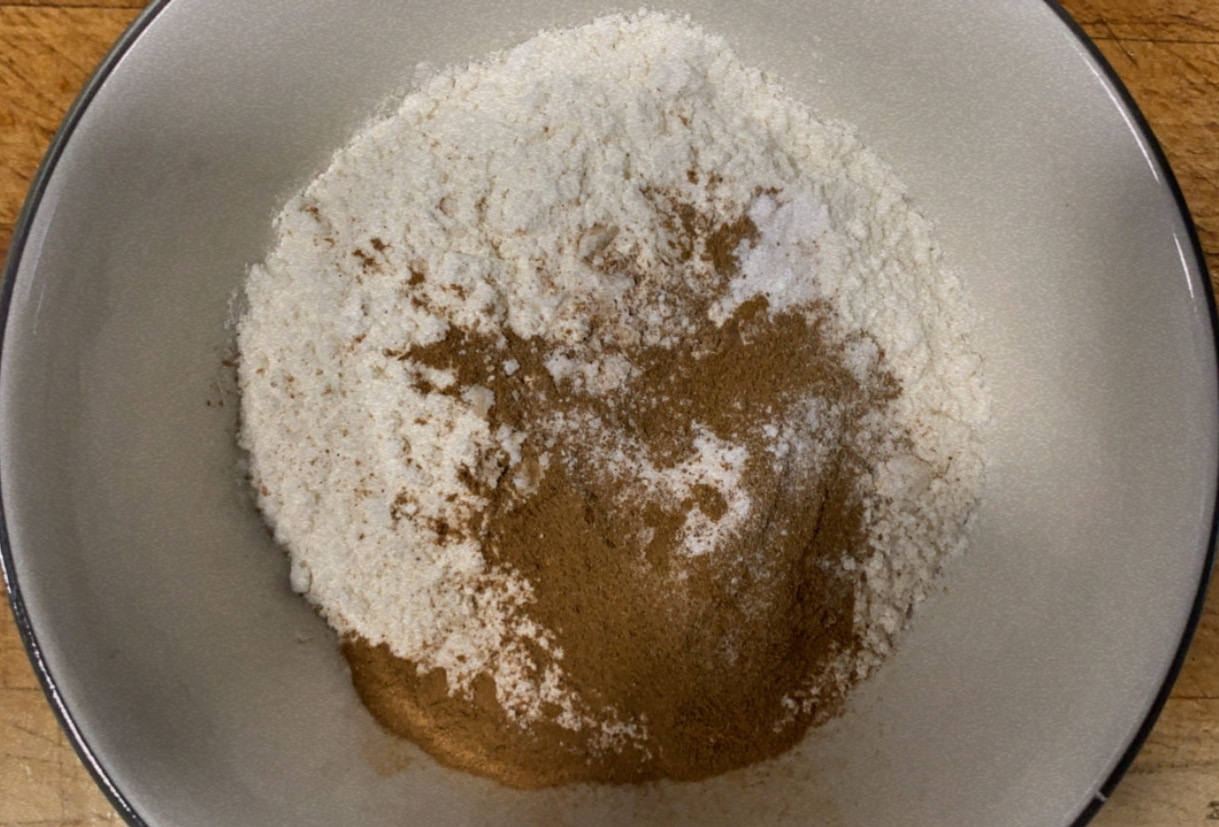 2.- En un bol, barregem la farina, el llevat, la canyella i la sal.