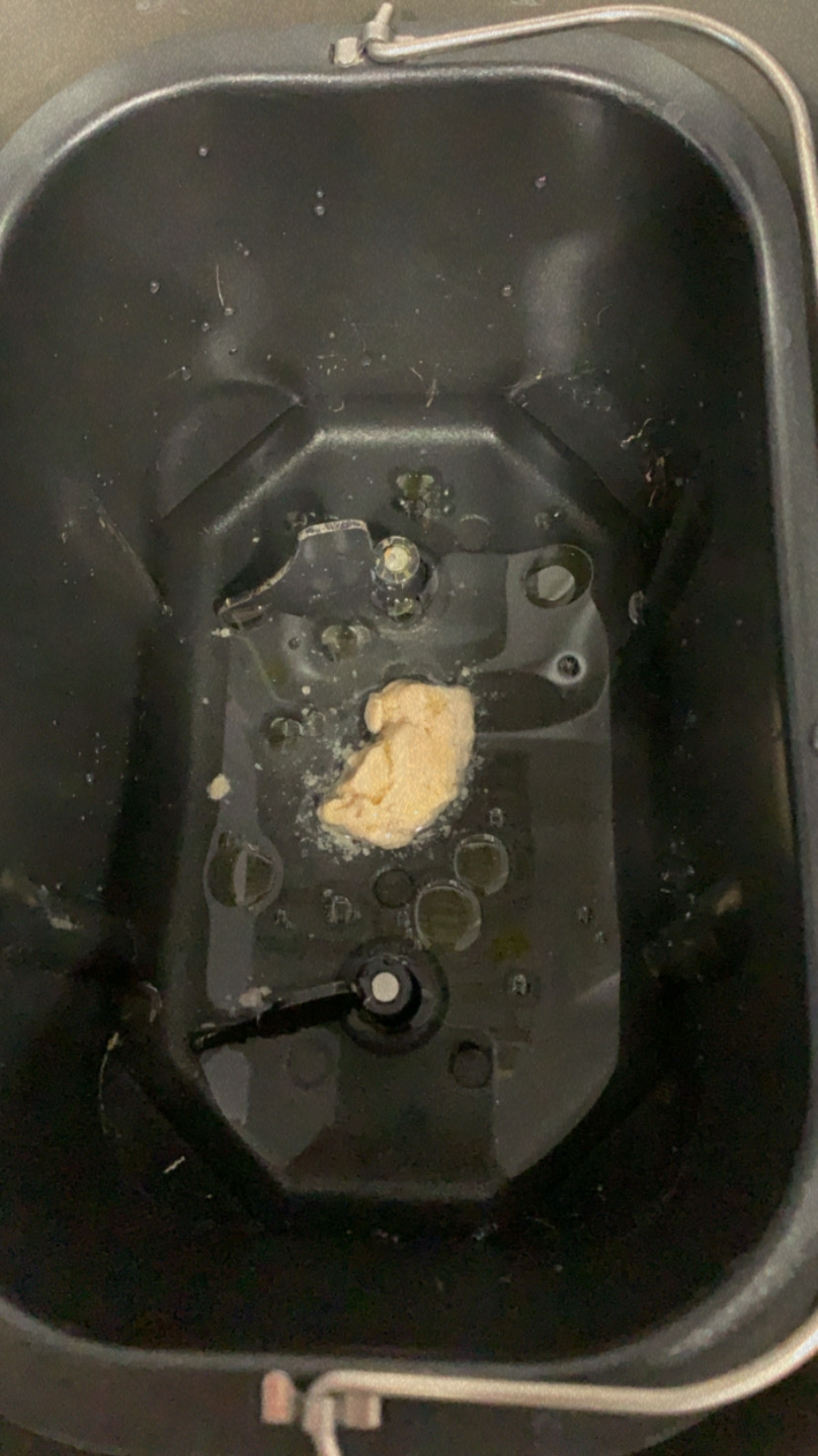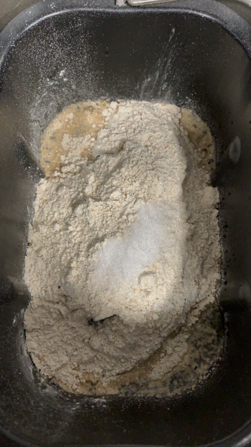 1.- Posem a la panificador l’aigua, l’oli d’oliva i el llevat fresc.