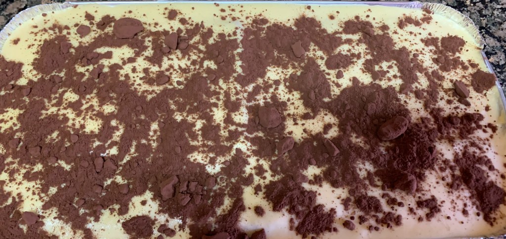 7.- Finalment, hi afegim una darrera capa de massa de formatge. Quan ja tinguem el motlle ple, hi posem el cacau en pols per sobre, i col·loquem el pastís a la nevera unes 2 hores abans de consumir-lo (preferentment el deixarem tota la nit).