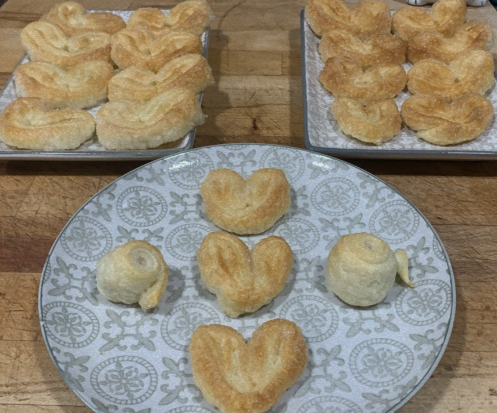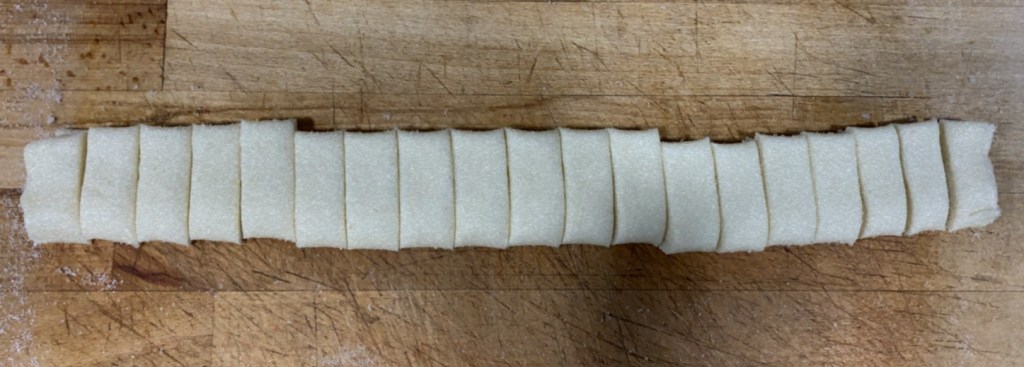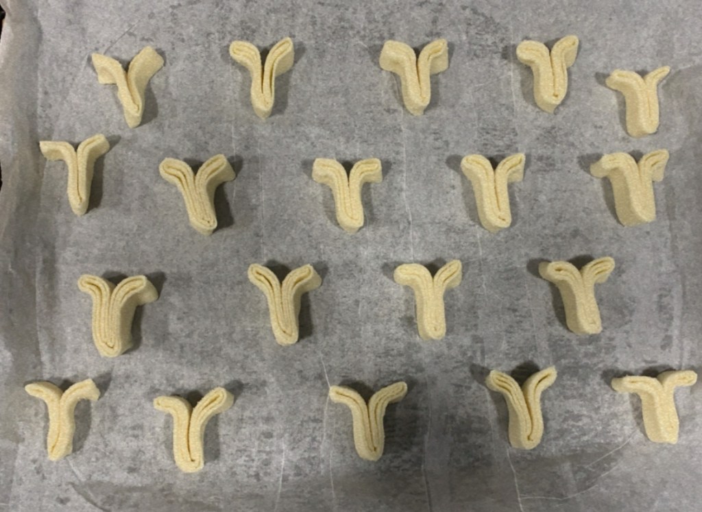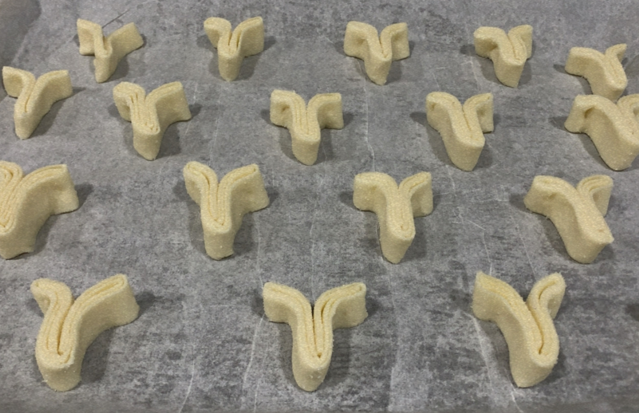 6.- Ara, haurem de tallar la massa amb molt de compte i formar les palmeres. Perquè tinguin una mida semblant, podrem utilitzar el dit de mostra.