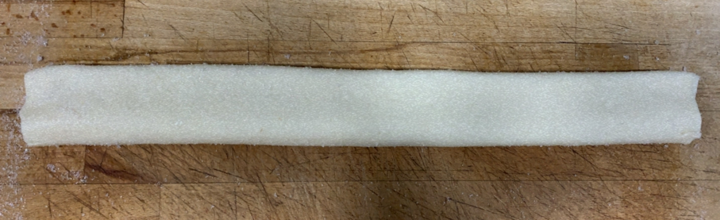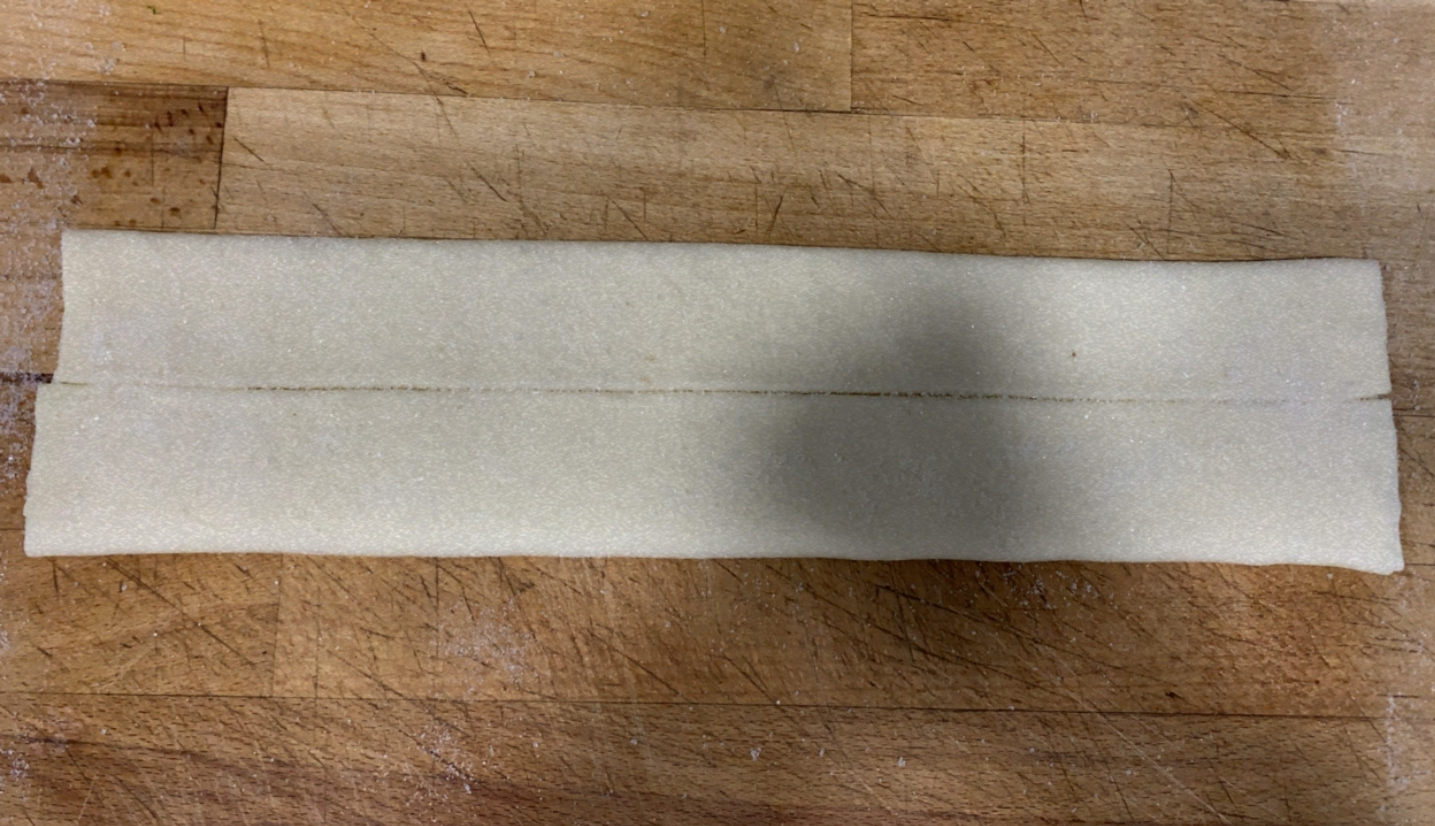 5.- Finalment, portarem l’extrem inferior de la massa fins a l’extrem superior, i el resultat serà una tira llarga amb diferents plecs.