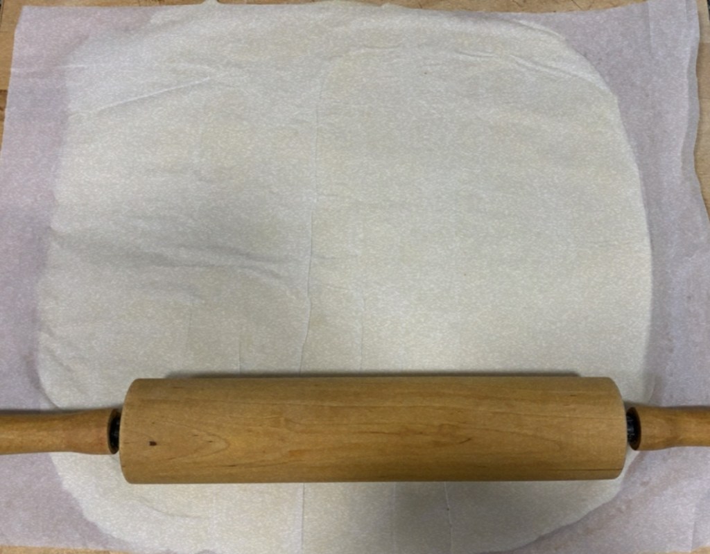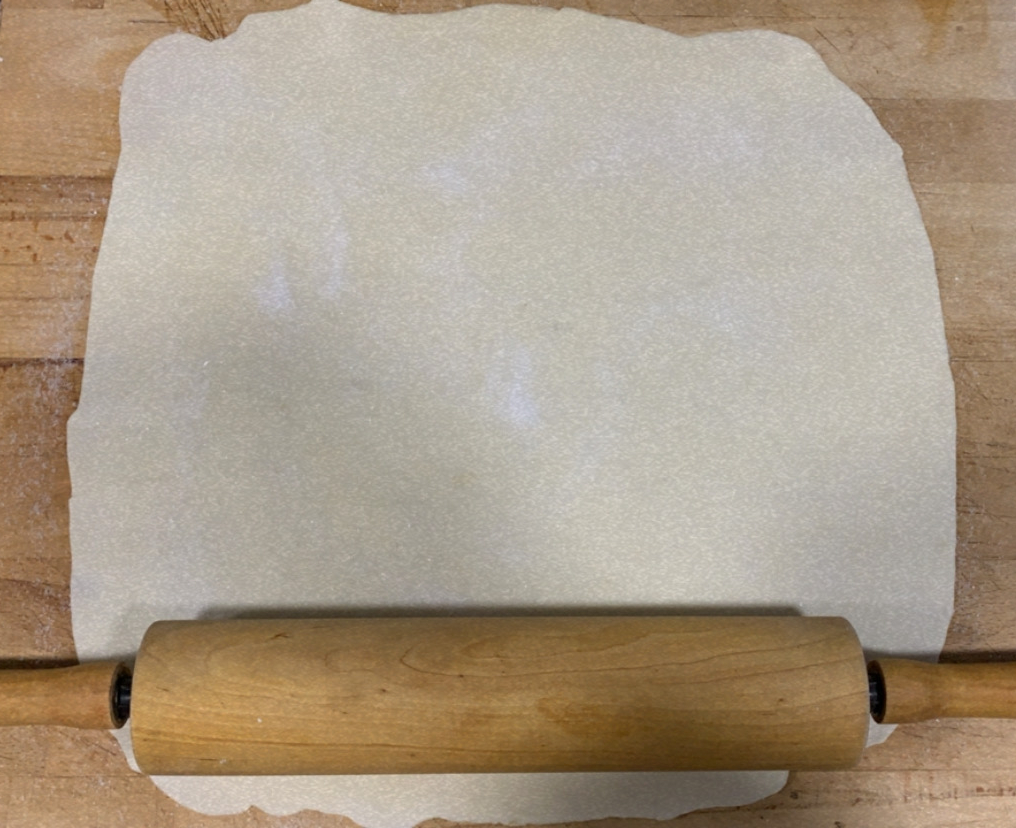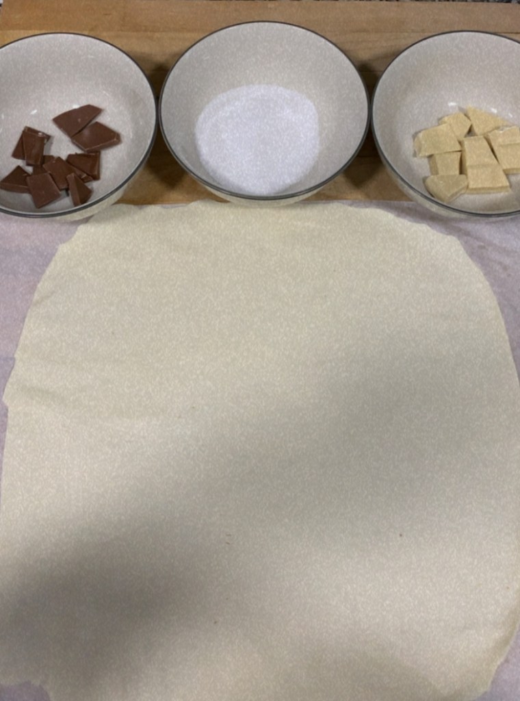 1.- Cobrim la taula de treball amb sucre, i hi estirem la massa de pasta de full perquè tingui forma rectangular. Amb l’ajuda del corró, farem que el sucre s’enganxi a la massa.