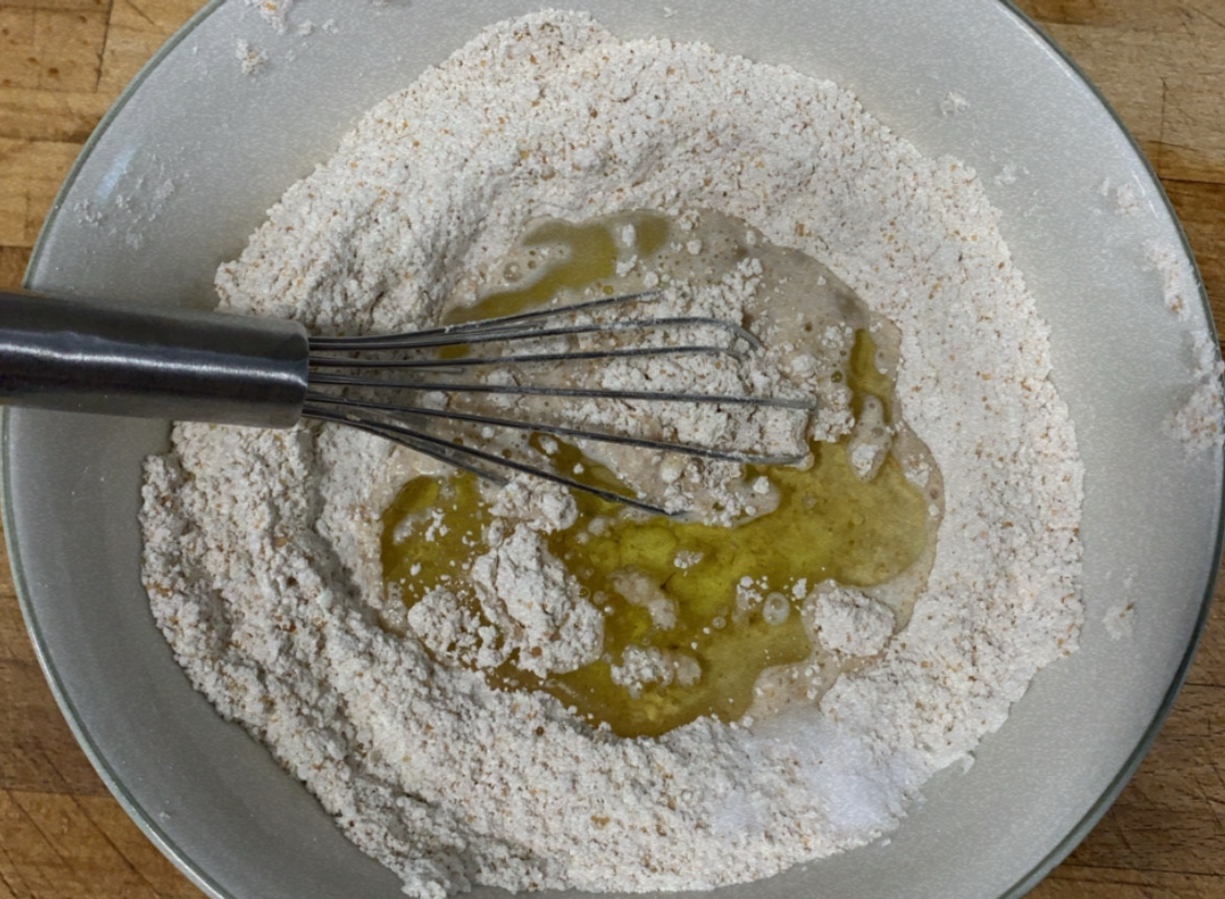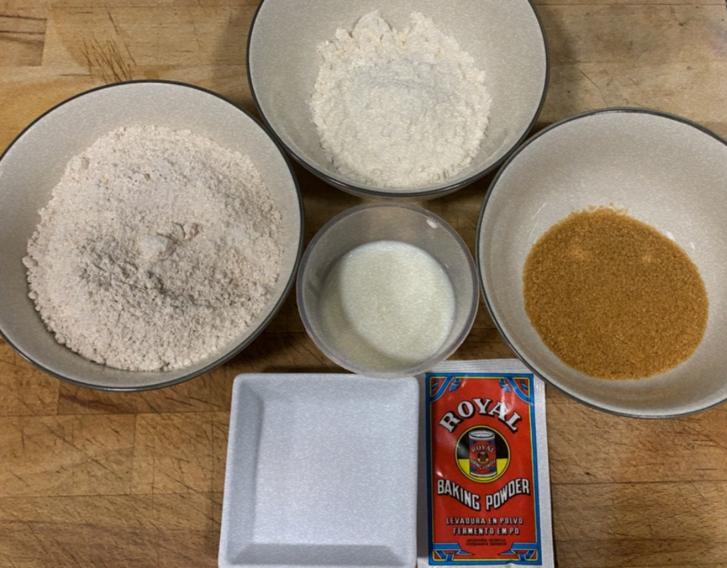 1.- En un bol, barregem la farina integral, la farina de blat, el sucre moreno i el llevat, fins que s’integrin.