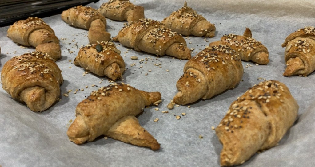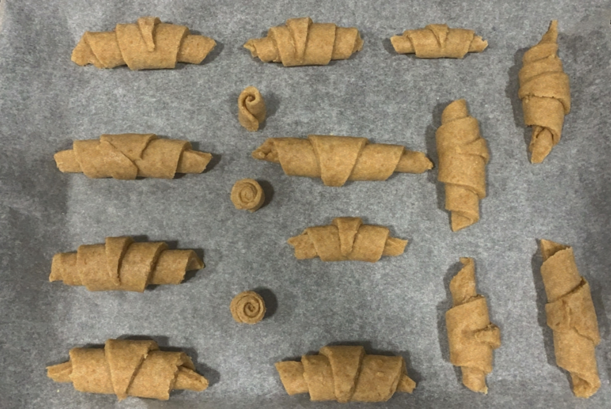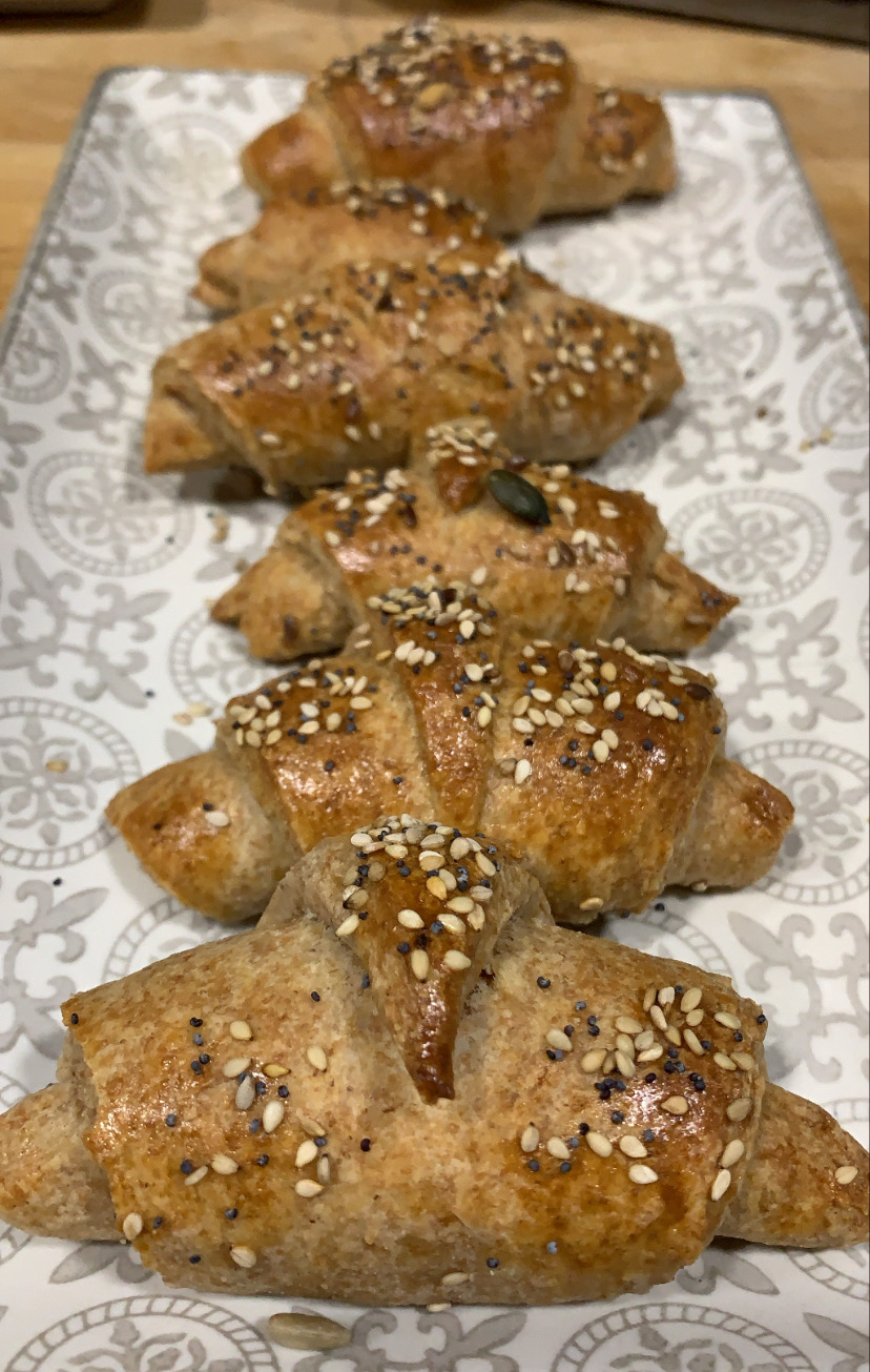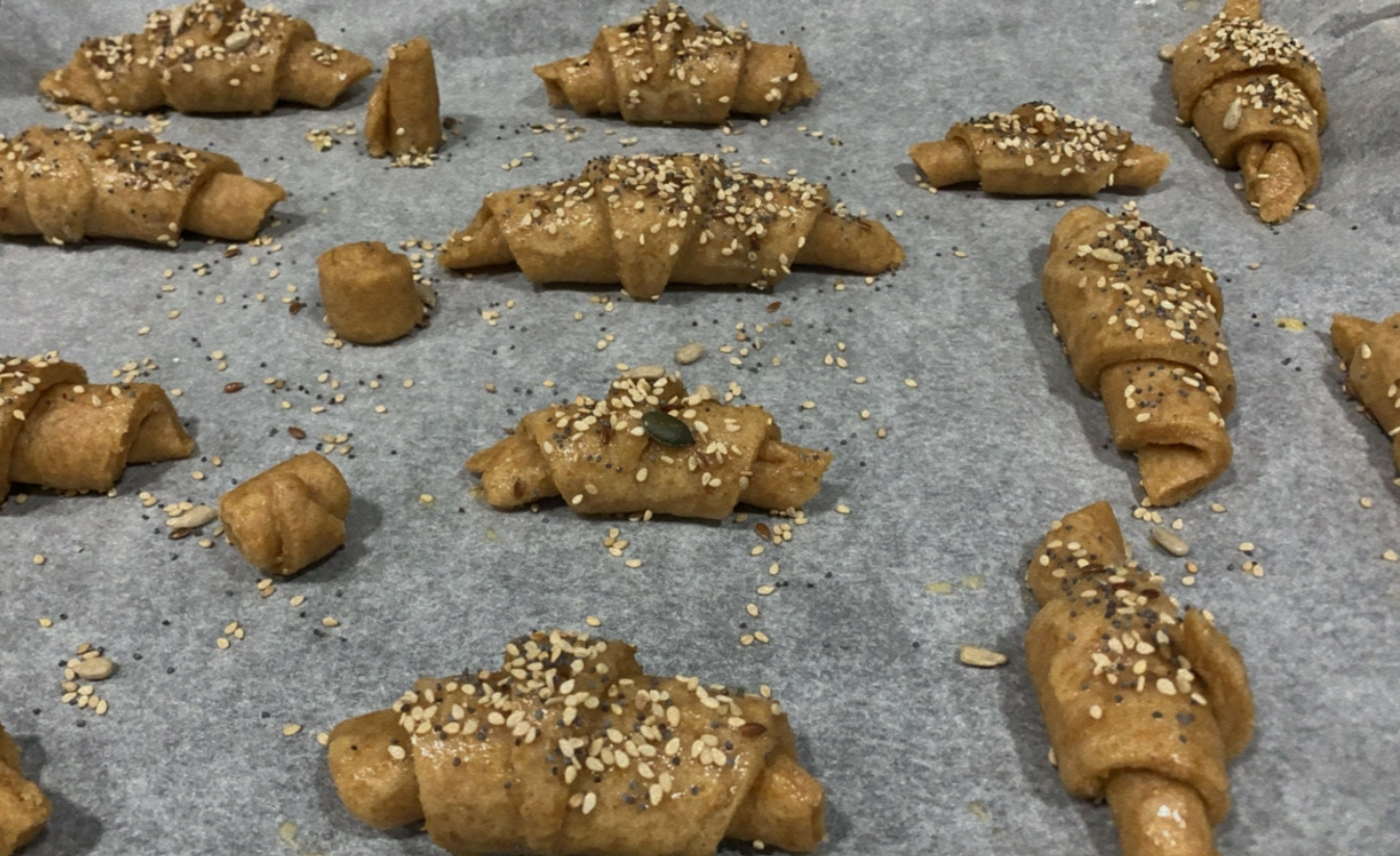 7.- Un cop passada l’estona, pintem els croissants amb ou batut i els posem al forn (prèviament escalfat a 180º) uns 15 minuts. Podem posar-hi llavors per a decorar.