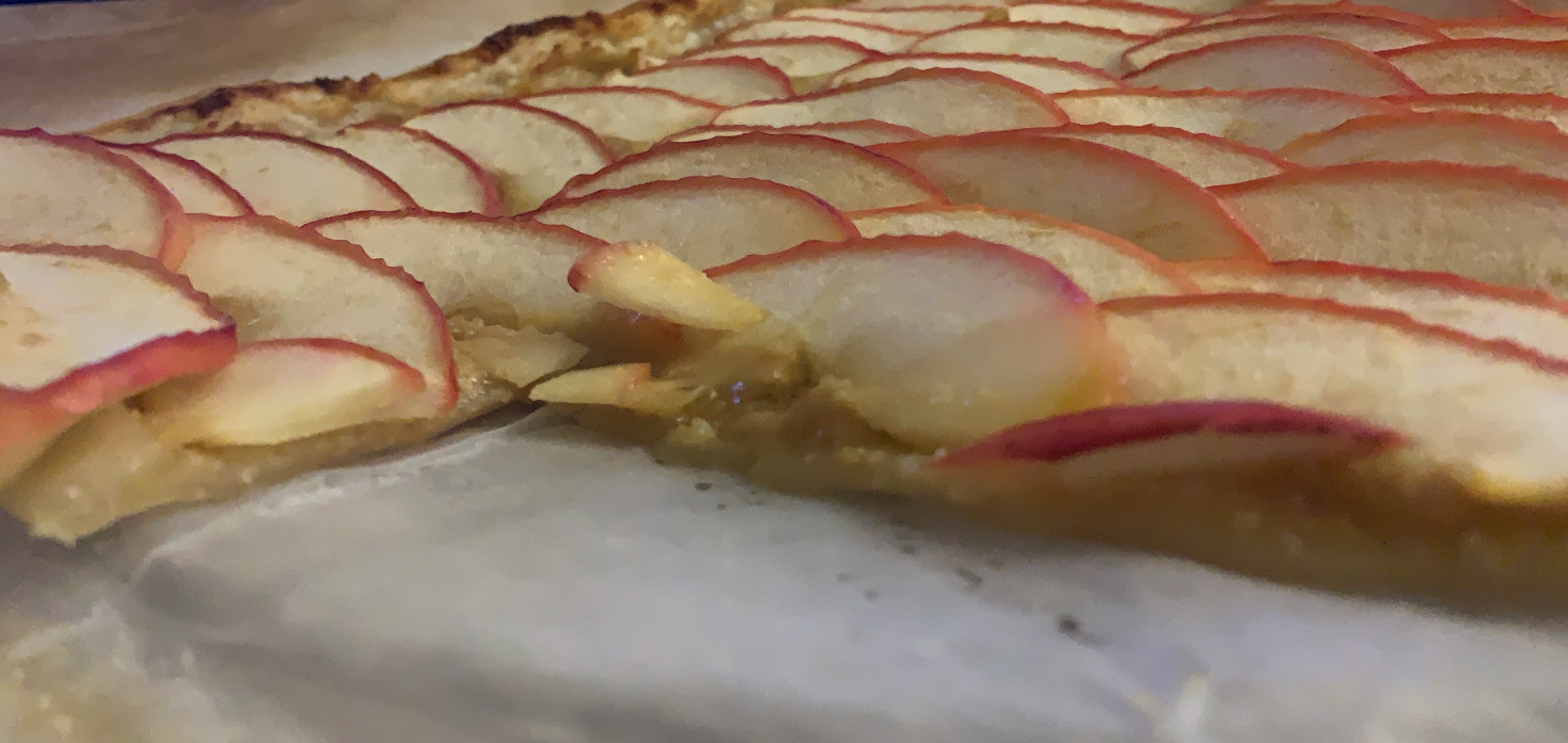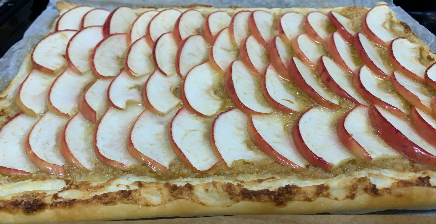 5.- Llavors, només ens caldrà treure els «cors» de les pomes i tallar-les en làmines ben fines, les quals disposarem sobre la massa. Sobre, hi podem espolvorejar sucre per a decorar.