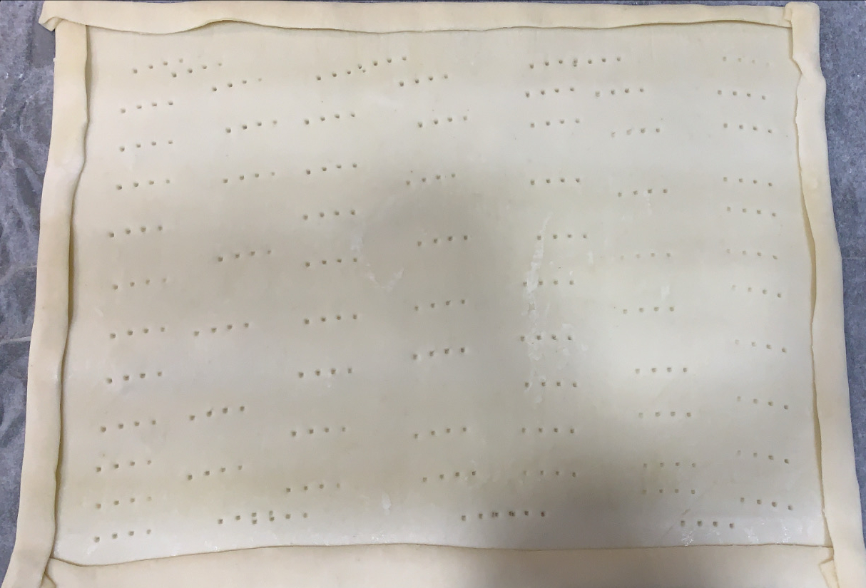 3.- Llavors, estenem a la plata que anirà al forn, amb el paper vegetal, la massa de pasta de full. Haurem de doblar-ne els costats i punxar amb una forquilla la resta de la massa.
