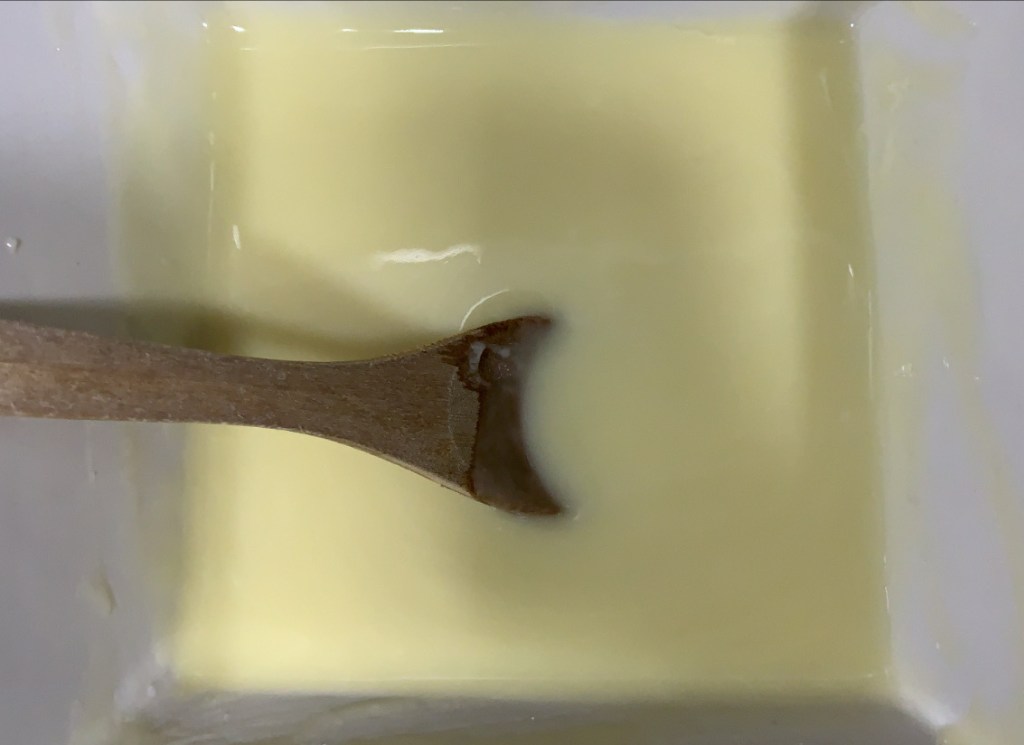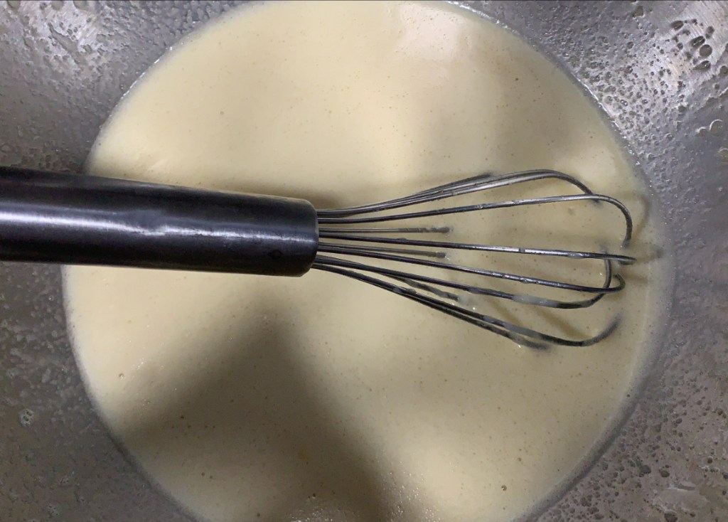 3.- Hi integrem la barreja de la mantega i la xocolata blanca, l’essència de vainilla i la llet, poc a poc, fins que s’integrin bé.