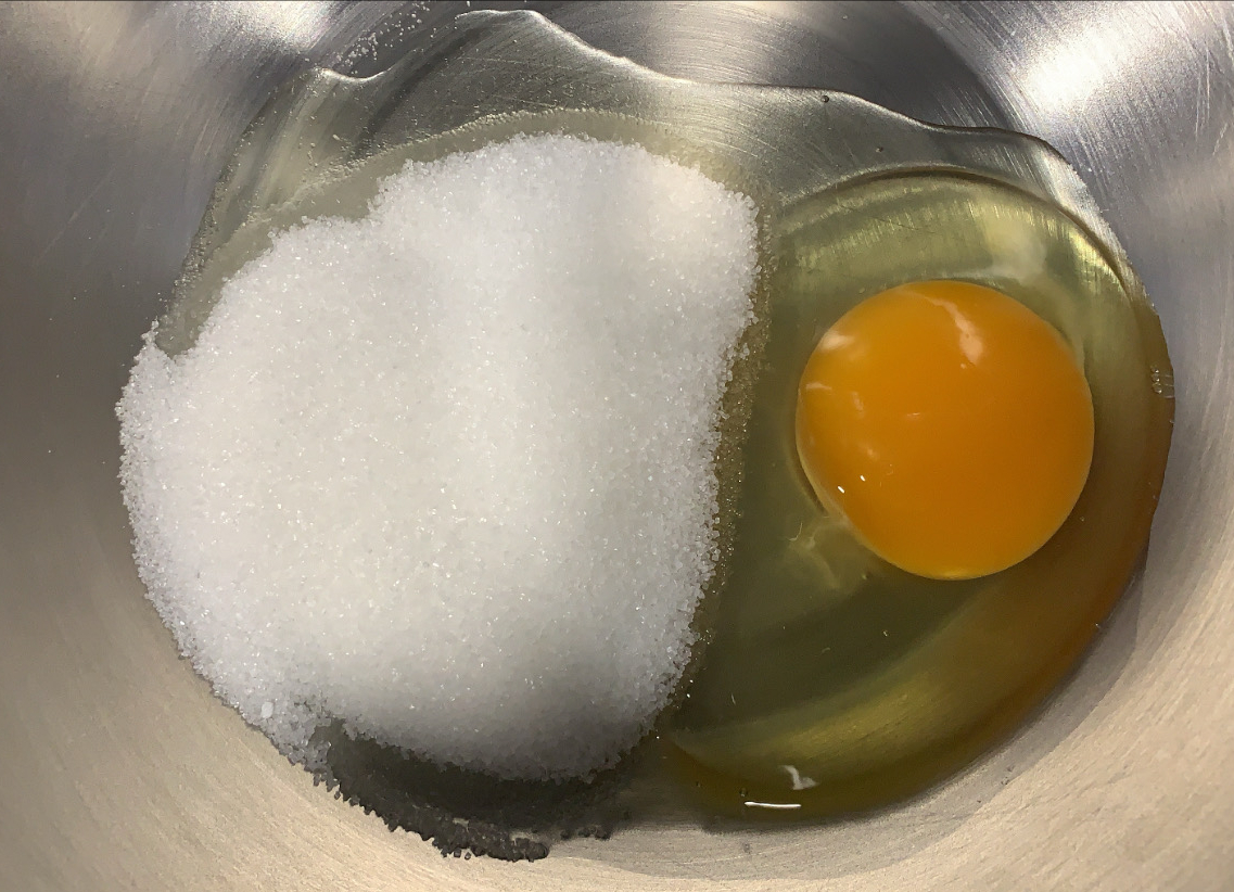 2.- En un altre bol, batem amb unes varilles manuals l’ou amb el sucre, fins que la barreja sigui esponjosa