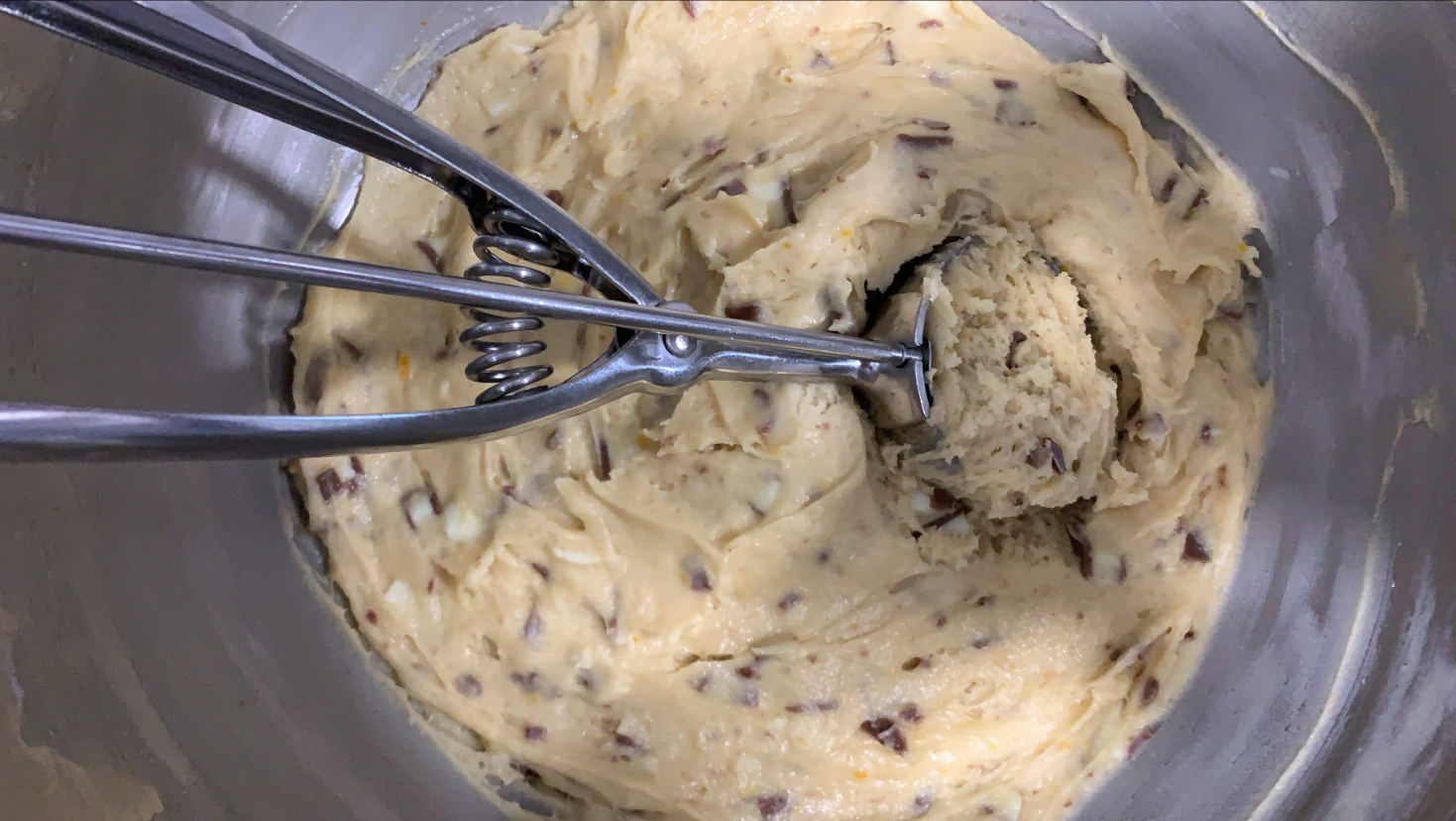 6.- Un cop fora de la nevera, col·locarem la massa en motllos de muffins. Per tal que quedin el més uniformes possible, amb un utensili per als gelats podem fer les boles. Podem decorar les magdalenes amb la barreta reservada anteriorment.