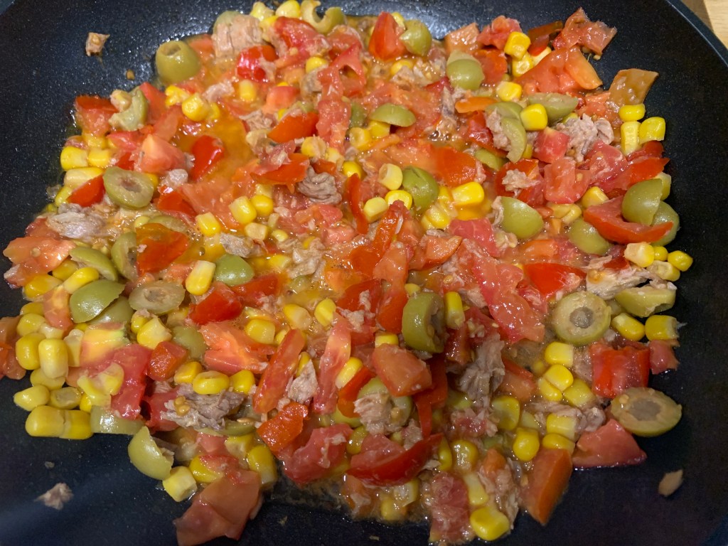 1.- En una paella, posem tots els ingredients; la tonyina, blat de moro, olives i els tomàquets trossejats.