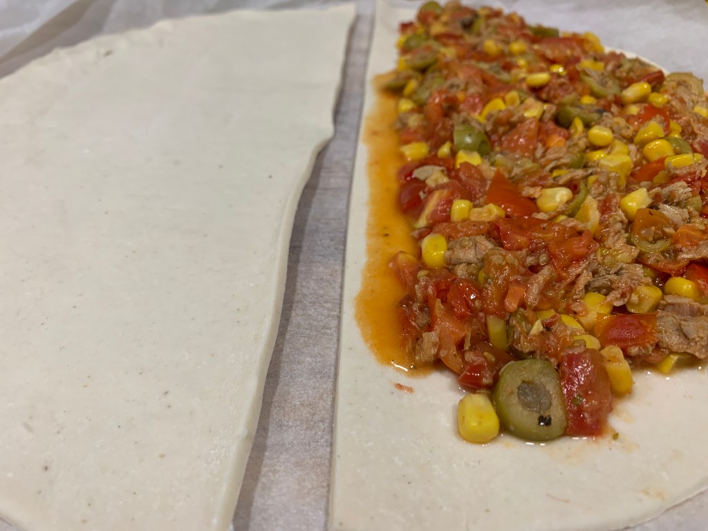 3.- Per altra banda, extenem la massa de pasta de full i la partim per la meitat. Repartim la barreja i tapem amb la meitat de la massa.