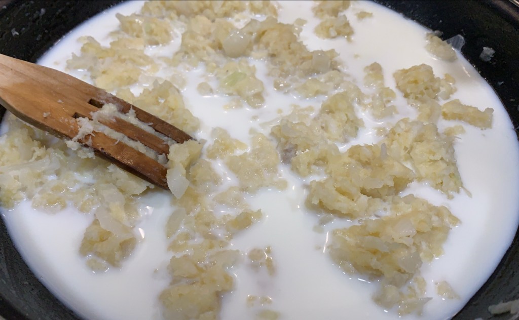 4.- A continuació, afegim la farina i, quan estigui incorporada, poc a poc anirem posant la llet. Cal que aquesta vegi integrant-se a la massa i s’espessi bé, sense deixar de remenar.