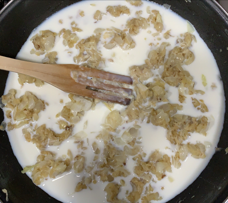4.- Hi afegim la farina i, passats 2 minuts aproximadament, podem anar incorporant, molt poc a poc, la llet. És important no deixar de barrejar, i tenir molta paciència, perquè cal que la massa sigui homogènia i estigui ben espessa, no es pot enganxar a la paella.