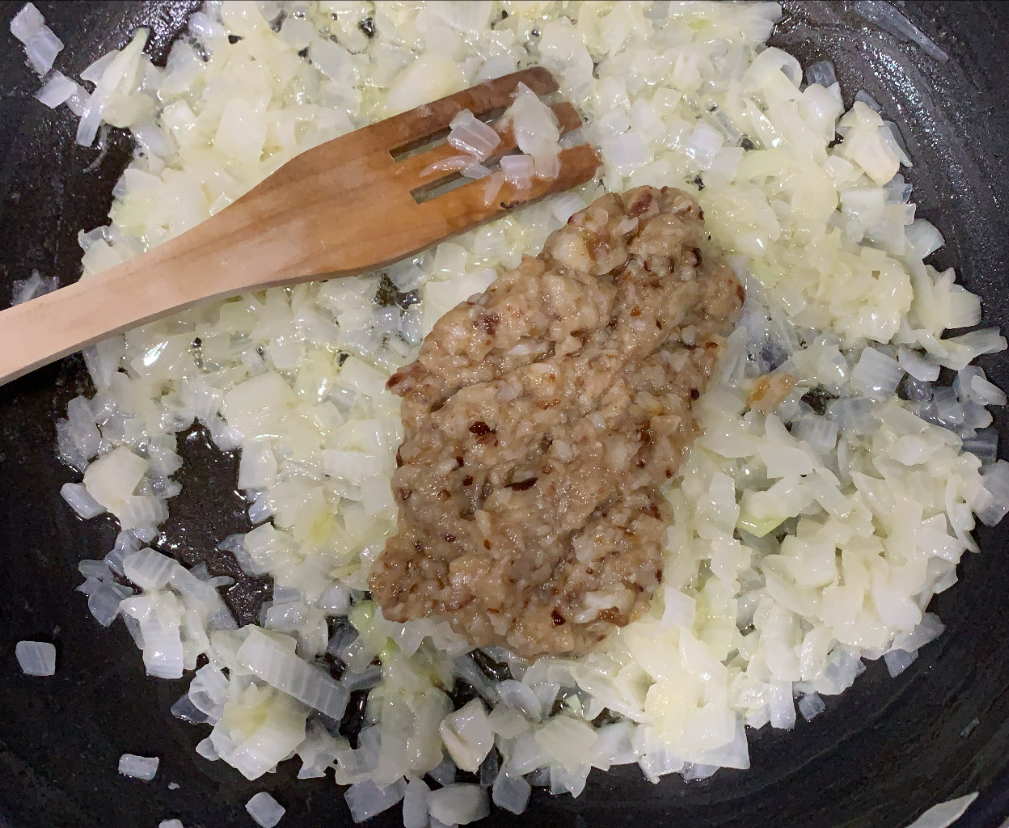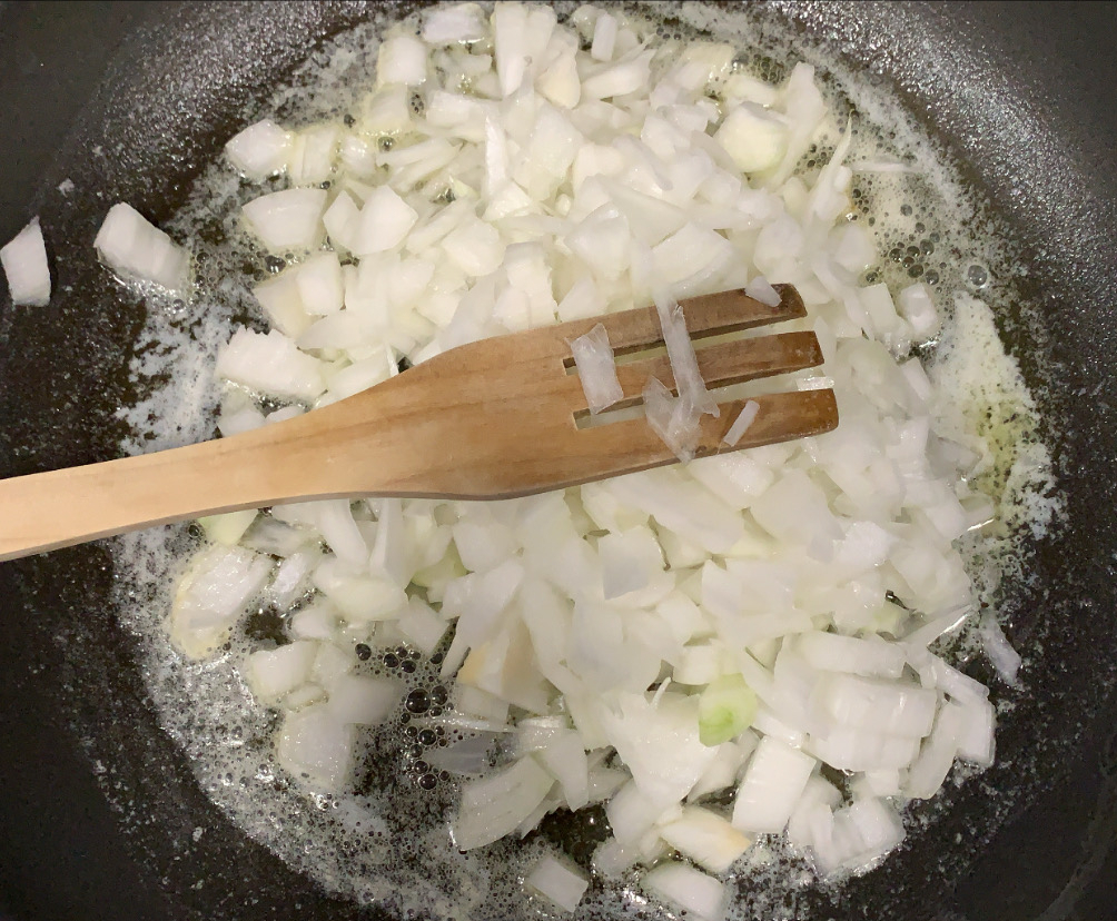 2.- Posem la mantega en una paella a foc baix i, un cop desfeta, hi afegim la ceba. La deixem uns minuts fins que comenci a agafar color.