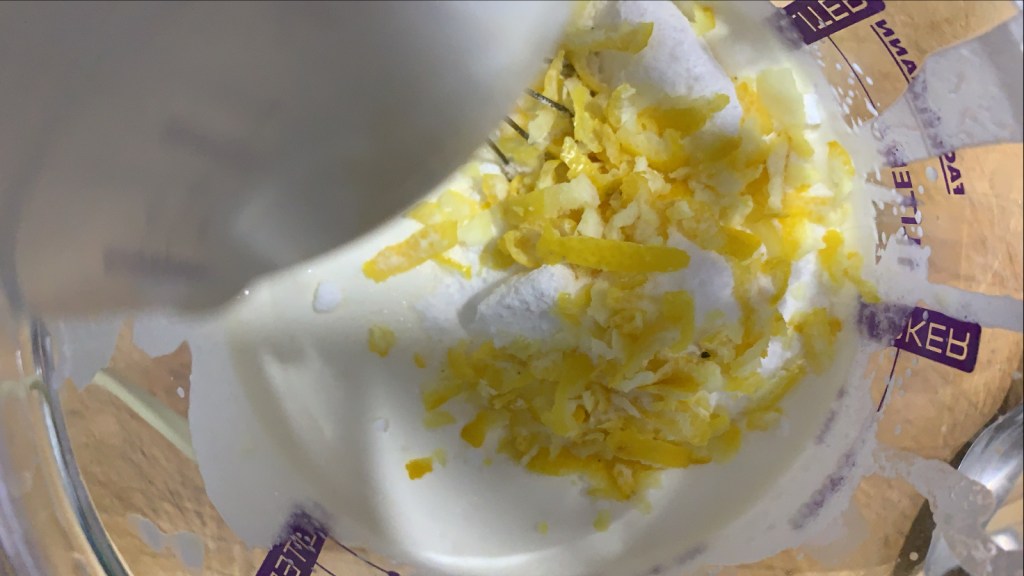 3.- A continuació, haurem de muntar la nata. A meitat del procés, hi afegim la ratlladura de llimona i l’altre meitat del sucre glacé, i acabem de muntar-ho tot.
