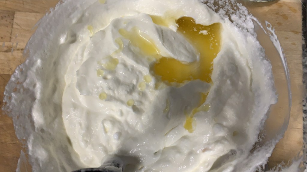 1.- Muntem les clares a punt de neu i, quan encara no estiguin del tot muntades, hi afegim la meitat del sucre glacé (aprox. 45gr) i les acabem de muntar. Reservem.