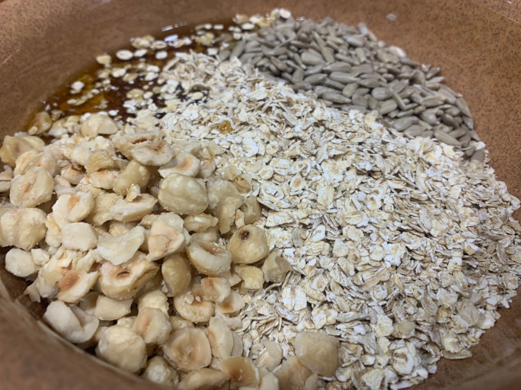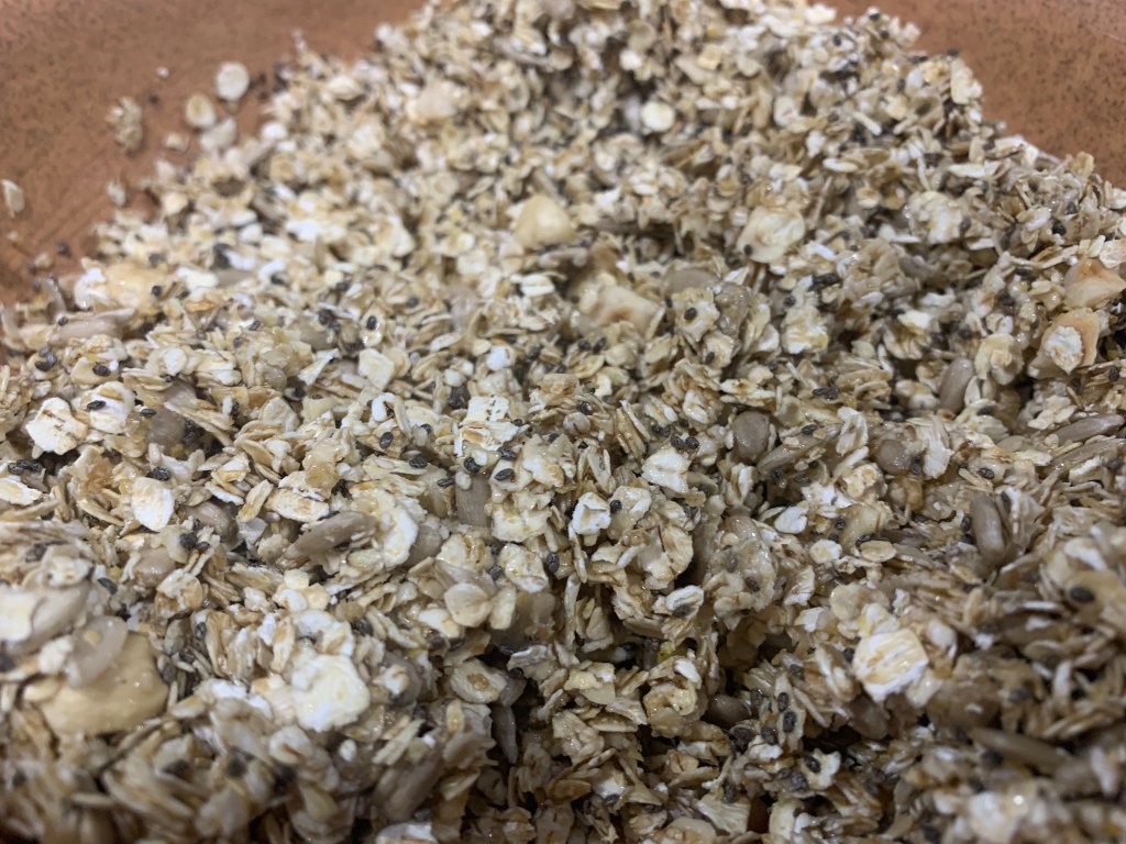 3.- Posem la barreja a l’AirFryer, escalfada prèviament a 180º, durant uns 10-15 minuts. És important anar obrint-la i remenant cada 5 minuts per a evitar que es cremi.