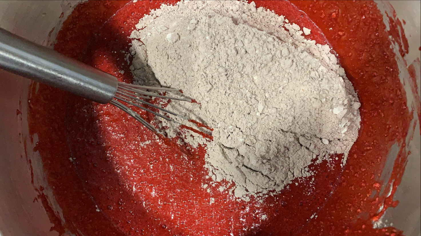 3.- Hi afegim la barreja líquida, passada per un colador per retirar la ratlladura de llimona i branca de canyella, i integrem.